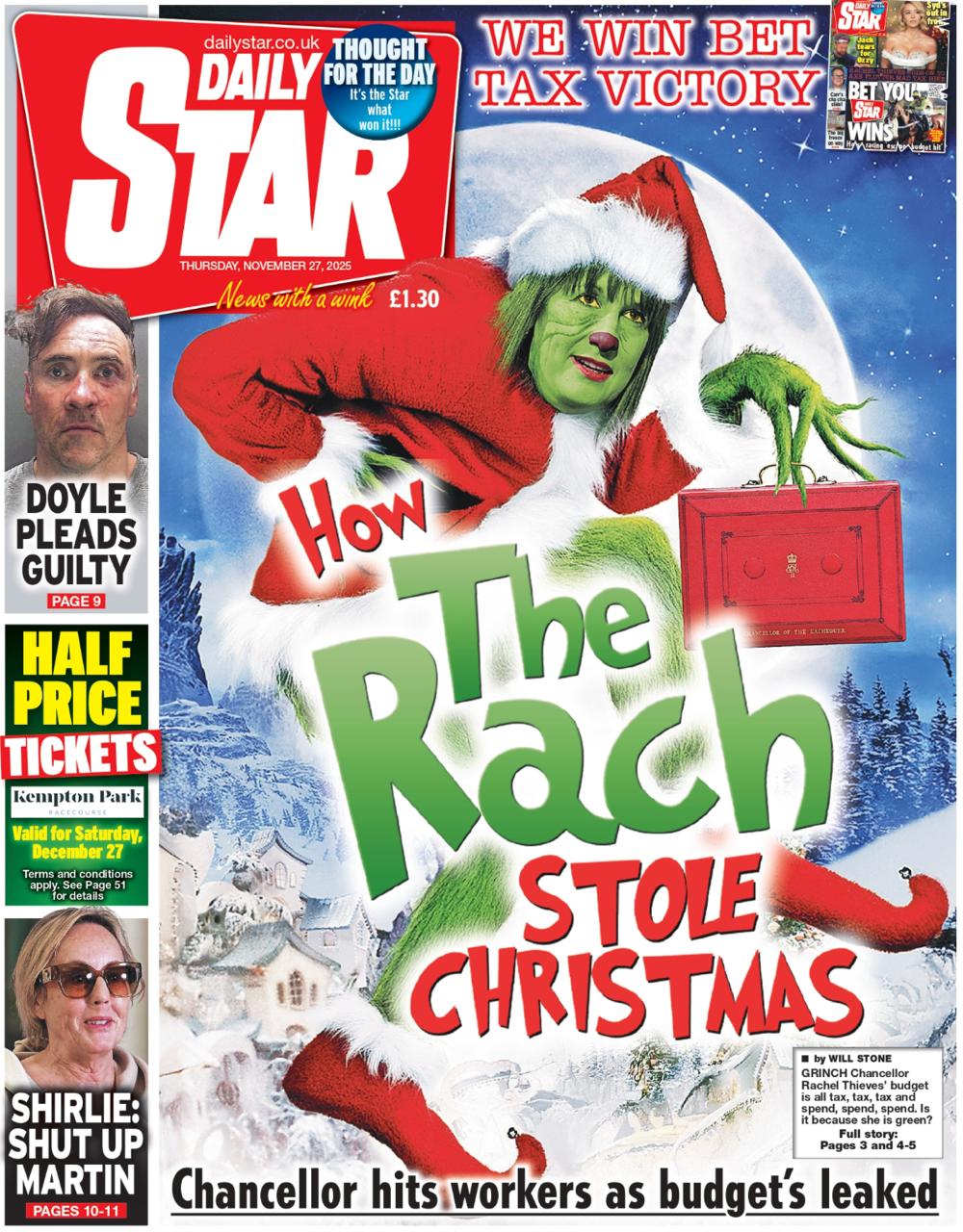 Отсюда — и обложка Daily Star о том, что канцлер Британии Рейчел Ривз украла Рождество.